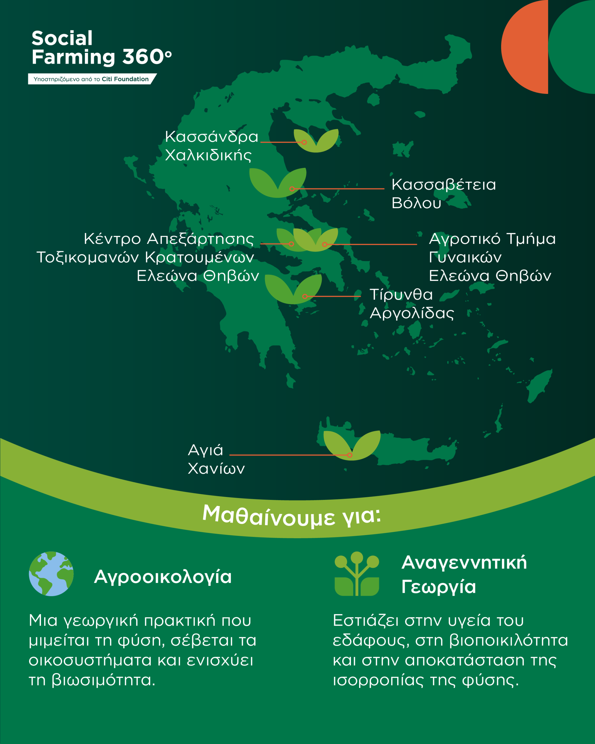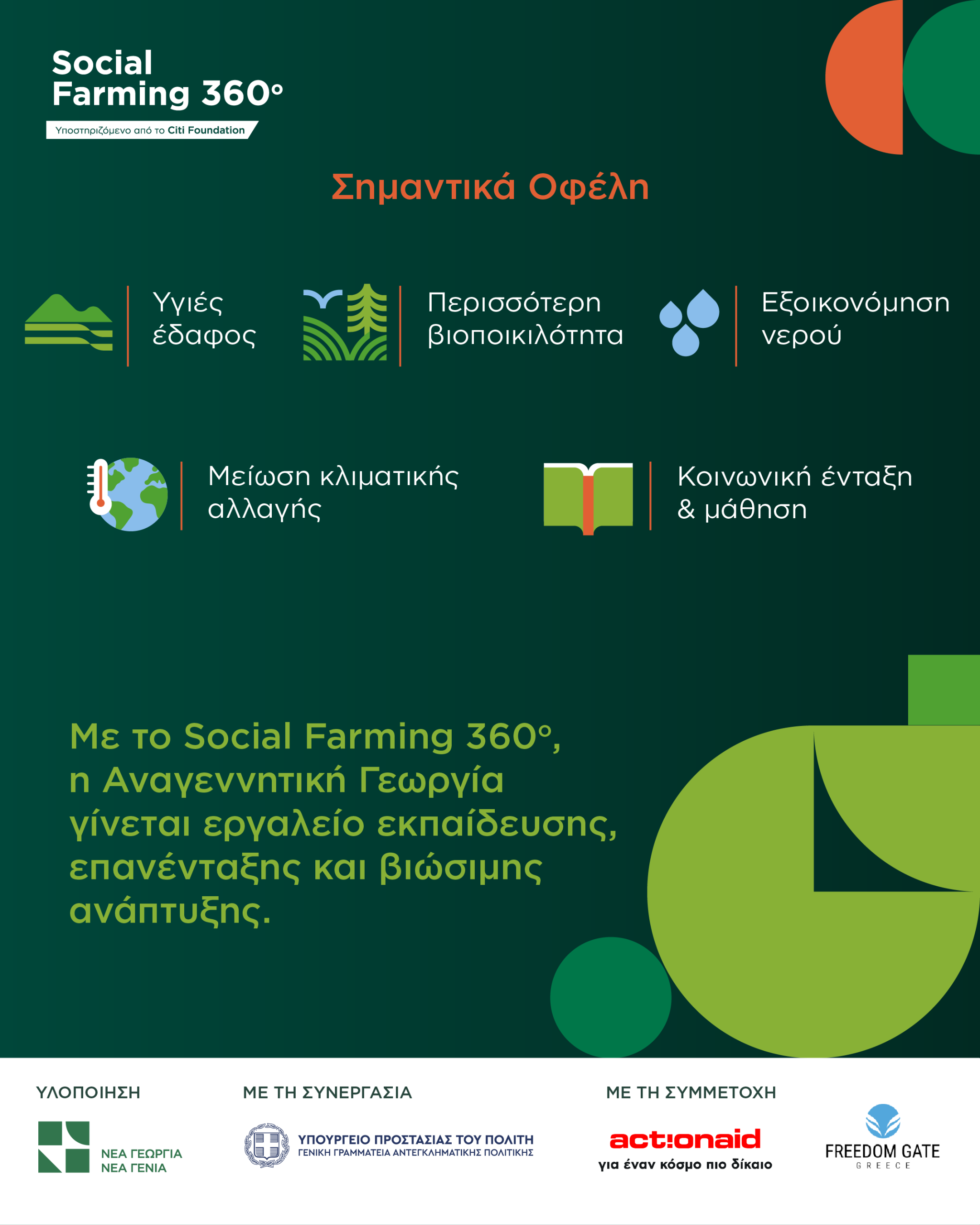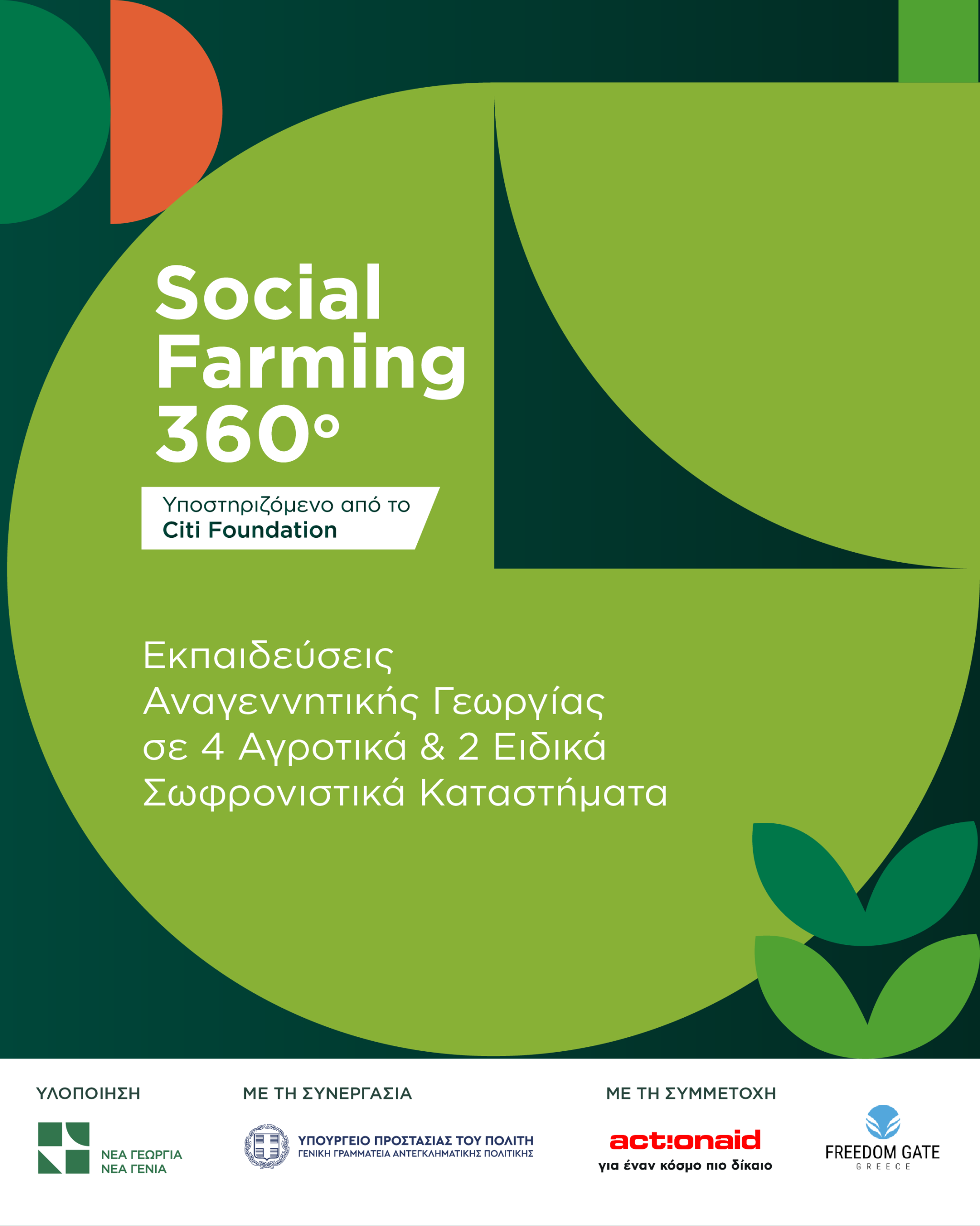 Με την υποστήριξη του Ιδρύματος Citi και σε συνεργασία με τη Γενική Γραμματεία Αντεγκληματικής Πολιτικής, το Social Farming 360 είναι ένα διετές πρόγραμμα που περιλαμβάνει πολλαπλά επίπεδα παρέμβασης. Το πρόγραμμα υποστηρίζει τη βιώσιμη παραγωγή και διάθεση τροφίμων σε τέσσερα αγροτικά σωφρονιστικά καταστήματα (Αγιά Χανίων, Τίρυνθα Αργολίδας, Κασσαβέτεια Βόλου, Κασσάνδρα Χαλκιδικής) και δύο ειδικά κέντρα κράτησης (Κατάστημα Κράτησης Γυναικών και Κέντρο Απεξάρτησης Τοξικομανών Κρατουμένων Ελεώνα Θηβών). Εκτός από την εκπαίδευση στον αγροτικό τομέα, το πρόγραμμα περιλαμβάνει την ανάπτυξη ήπιων δεξιοτήτων, ένταξη στην επαγγελματική ζωή και ψυχοκοινωνική εκπαίδευση, σε συνεργασία με την ActionAid και την Πύλη Ελευθερίας.