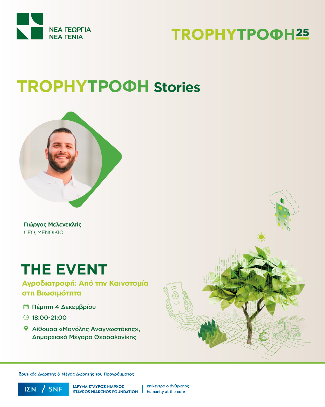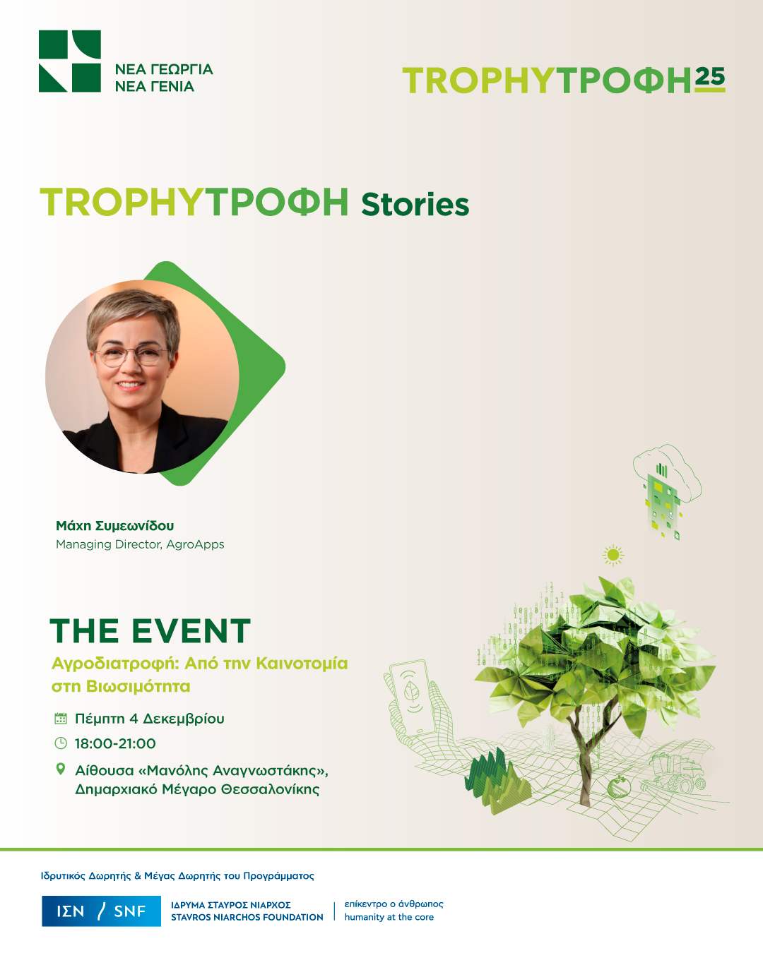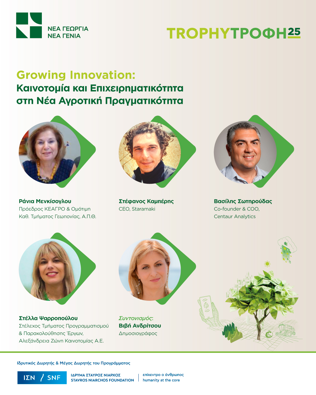 The event will culminate with the presentation of the teams that distinguished themselves in the TrophyΤροφή Meet-Ups 2025 and the announcement of the best business idea of TrophyTrophy 2025, marking the close of yet another cycle of inspiration, creativity, and collaboration for Greece’s agrifood sector.