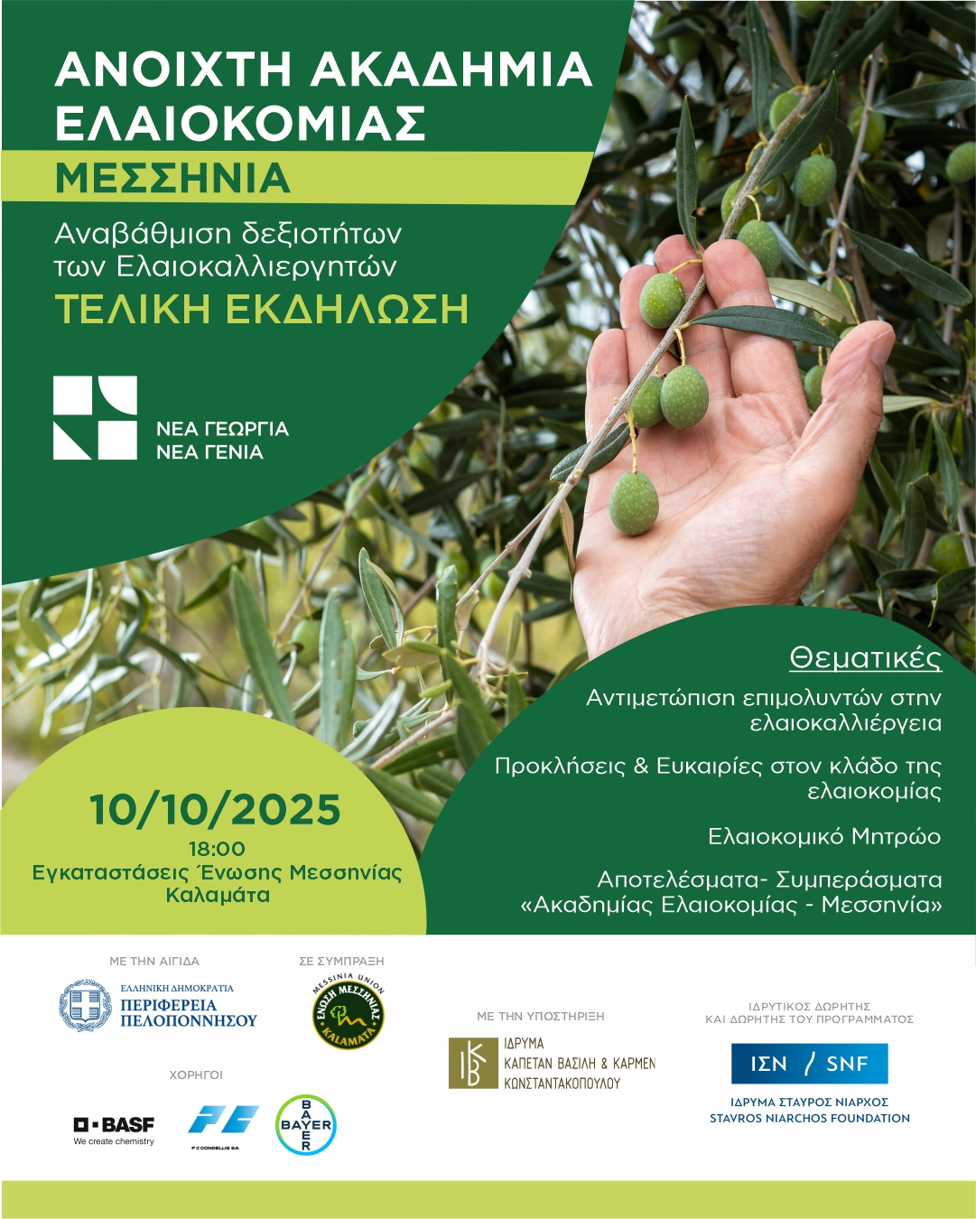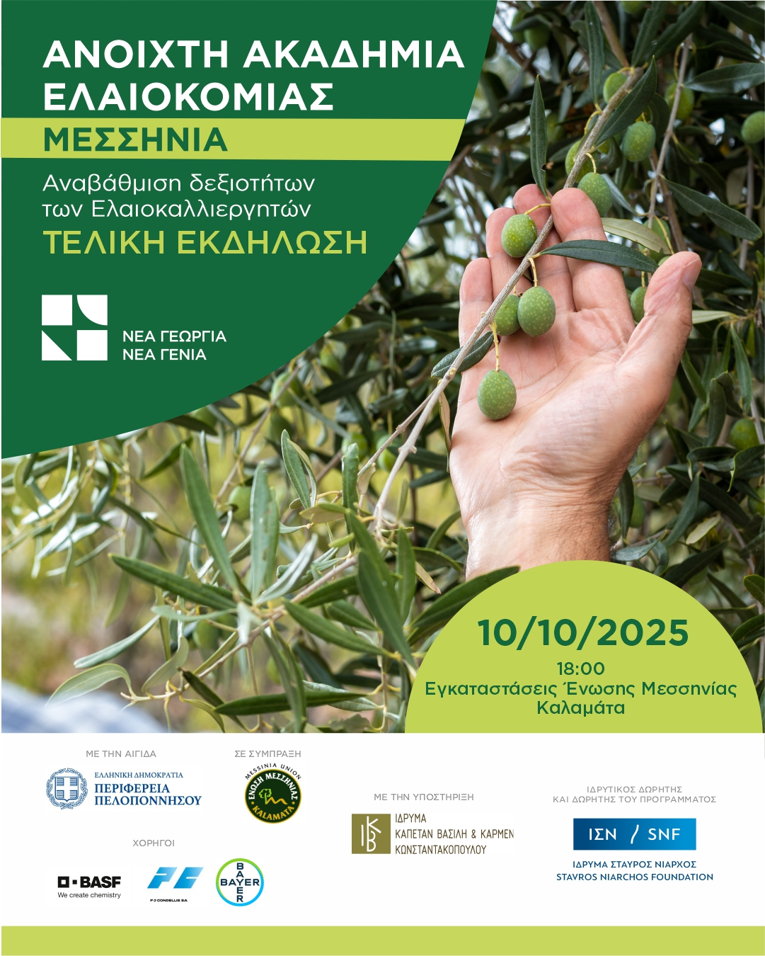 With a content-rich Final Event, the program “Open Olive Oil Academy – Messinia” comes to a close on Friday, October 10, 2025, at 18:00, at the facilities of the Agricultural Cooperative “Union of Messinia” (Thouria near Praktiker, E.O. Kalamata – Tripoli, Kalamata 24100).