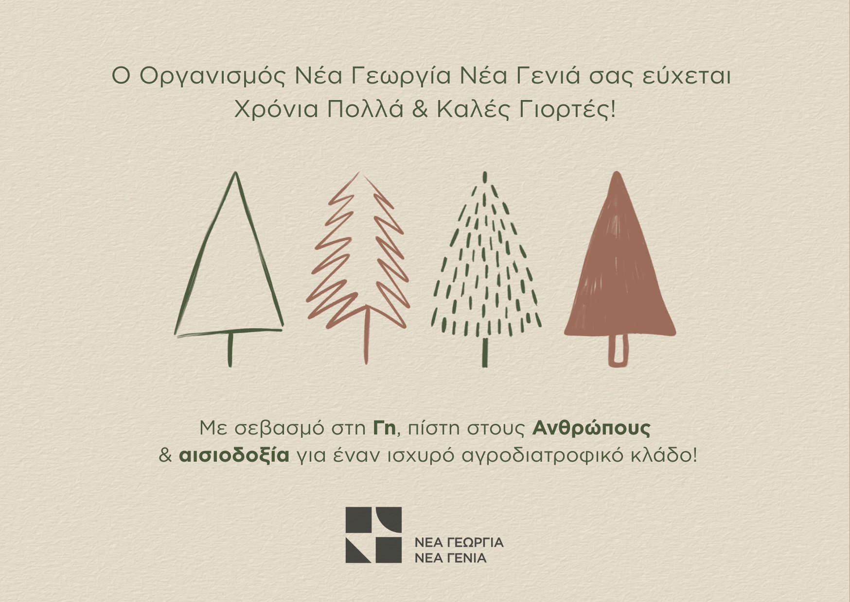 Ωστόσο, στρέφοντας το βλέμμα στα δικά μας, επιλέγουμε να διατηρήσουμε την αισιοδοξία μας. Η ελληνική αγροδιατροφή οφείλει να κινηθεί και πάλι σε εύφορα εδάφη και σε αυτό το πλαίσιο, ως Νέα Γεωργία Νέα Γενιά, επαναδιατυπώνουμε τη δέσμευσή μας να συστρατευθούμε με τις δημιουργικές, υγιείς δυνάμεις της χώρας σε αυτή την κατεύθυνση.
